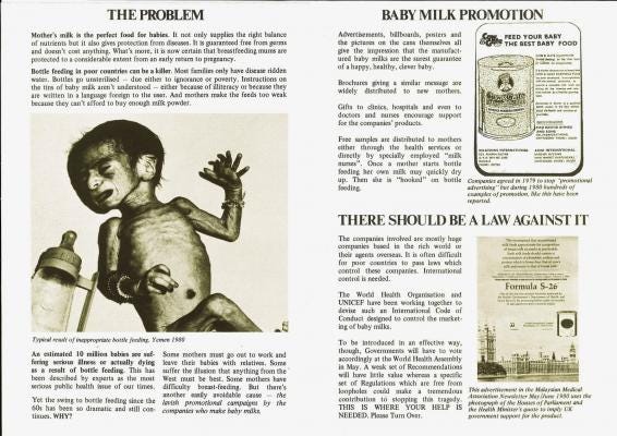 Chú thích ảnh (có thể xem ở link trên): Ảnh này là một trong những nội dung của tờ rơi trong chiến dịch tẩy chay vào năm 1983 nhằm các hãng sữa đã quảng cáo về sữa công thức ở các nước nghèo, đồng thời để khuyến khích việc nuôi con bằng sữa mẹ.